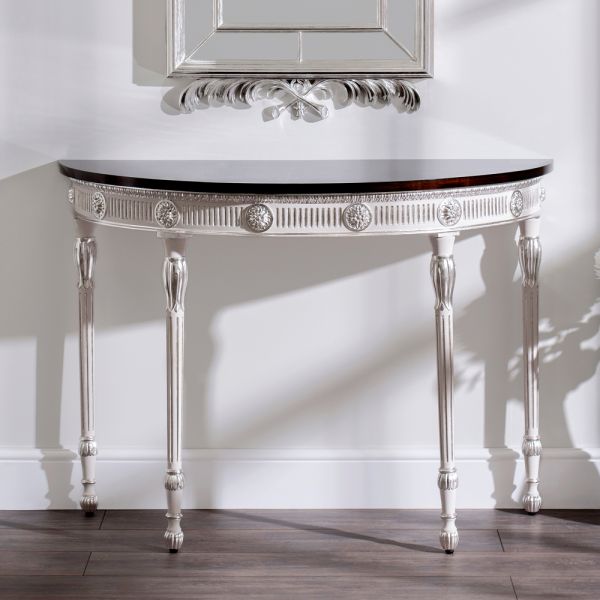 The Neo Classical Style Console Table and Mirror Set is a striking statement for any room in the house. Stunning examples of reproduction in 18th century style, in the most elegant of proportions and versatile in any setting. Shown here as an elegant hal