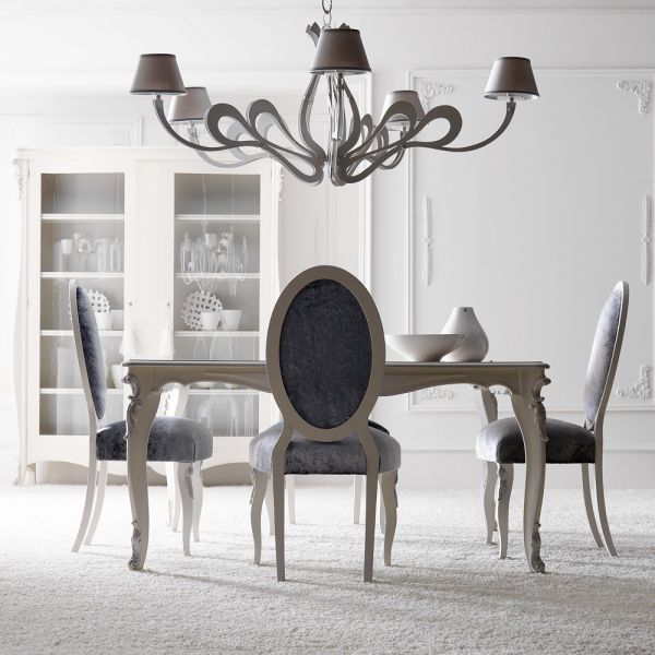 The High End Italian Silver Leaf Dining Table Set is a beautiful fresh statement for any dining area, creating a dramatic effect. The dining table is shown here with a vibrant antique white painted finish and hand painted silver leaf to the carved details