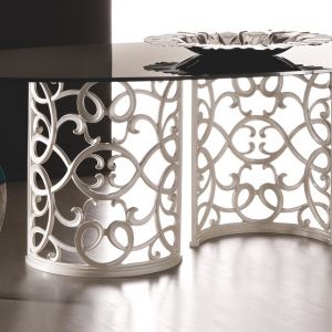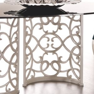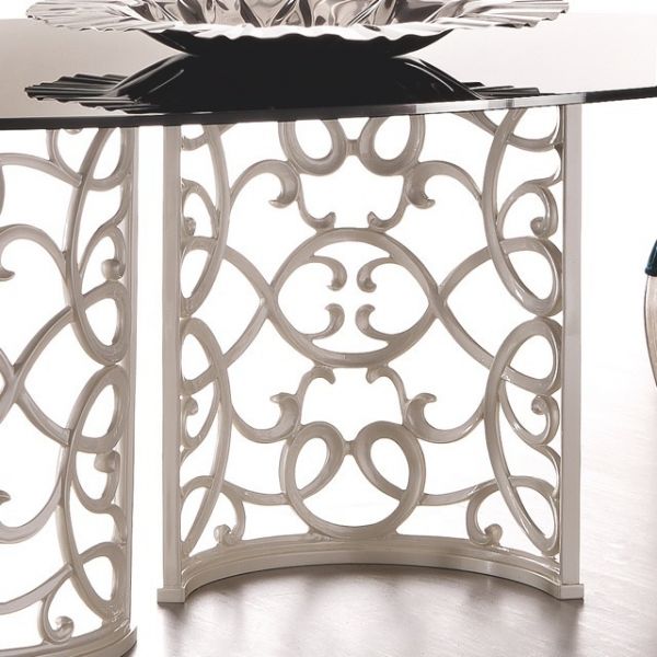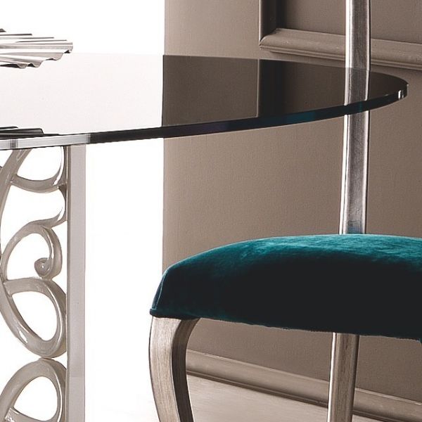 Mirror top designer dining table set. The table can be ordered in various sizes and the chairs upholstered as shown or in a change of fabric, including customers own fabric. Table shown here finished in high gloss white lacquer. Touchened safety mirror to