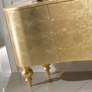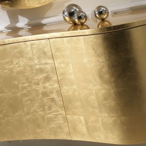 A solid beech wooden structure curvaceous by design, with a striking gold leaf finish to the structure and statement wood turned legs.