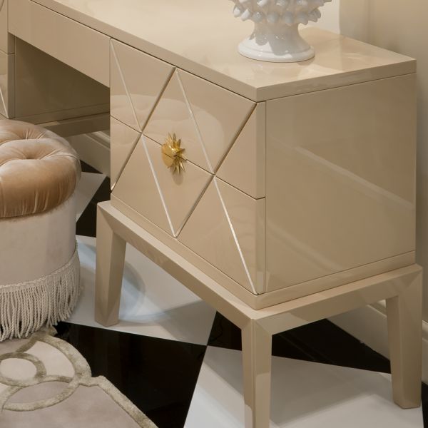 Made from solid beech wood finished with a taupe high gloss lacquer, this fabulous dressing table has a diamond pattern carved within the wood.