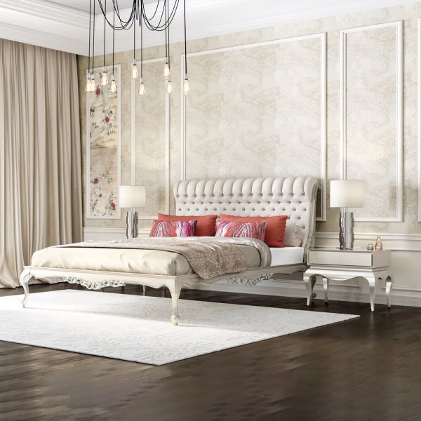 Finished in a smooth cream lacquer together with a linen upholstered drawer front creating a charmingly chic design.