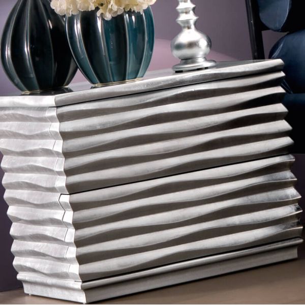 The Modern Designer Rippled Silver Leaf Bedside Cabinet with two discreet push-pull drawers adds a touch of modern glamour whilst being a versatile storage solution suitable for any room in the house. Shown here in a luxurious silver leaf finish to the un