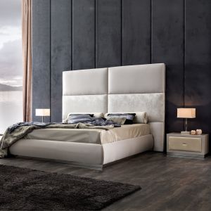 The Italian Nubuck Leather Bedside Cabinet with push-pull mechanism drawer. Shown here in a pearl finish and a high quality padded nubuck leather upholstery with minimal defining handle stitch detail to the drawer fronts on a nickel plinth base. This beau