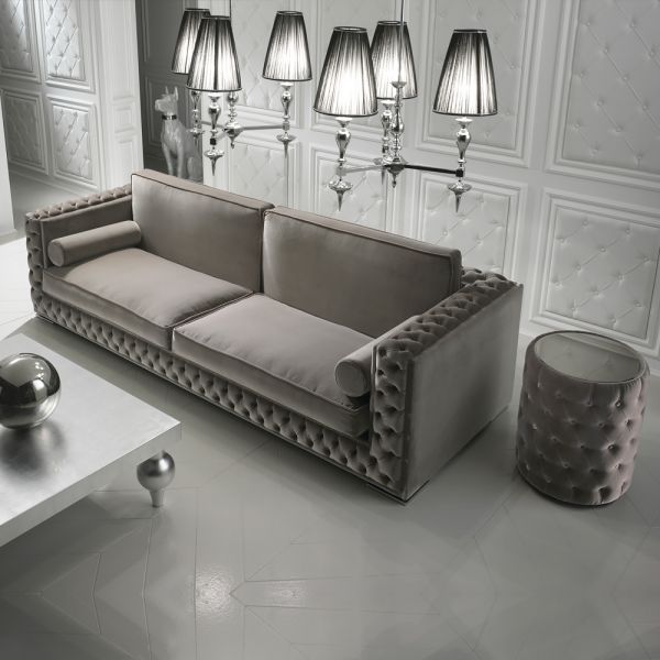 The Velvet Button Upholstered Round Mirrored Side Table. This gorgeous hand-crafted side table offers a superbly glamorous design, seductively modern and elegant. Created by Italian master craftsmen this design is outstanding in its attention to detai