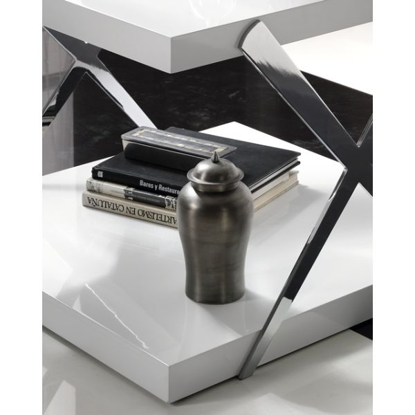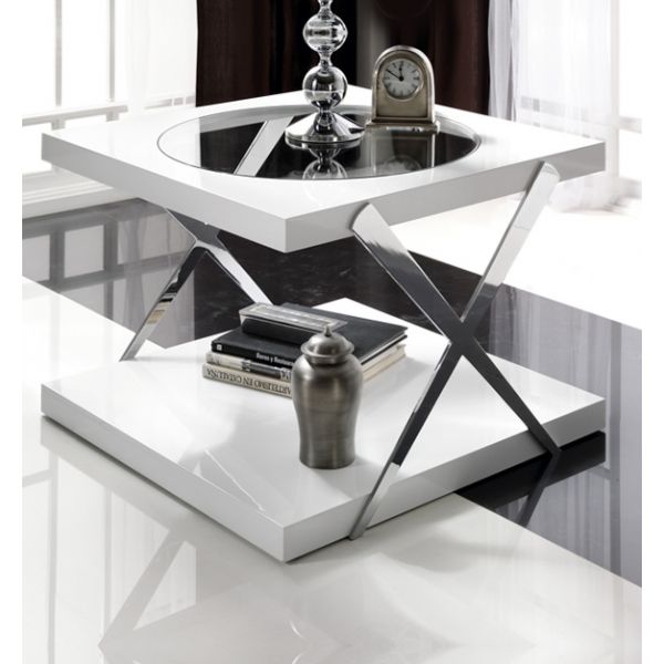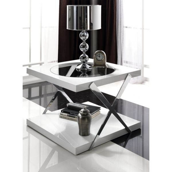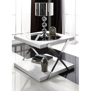 The London Collection White Modern Square Side Table is shown here finished in a high gloss white lacquer with stainless steel cross legs and it is completed with a round glass inlay.