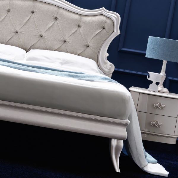 Italian Designer Pearl White Upholstered Bed. This seductive bed uses gorgeous finishes and textures to make an enchanting statement. The exquisitely carved headboard bed rail and delicate feet are all finished in a dreamy mother of pearl white lacquer. A