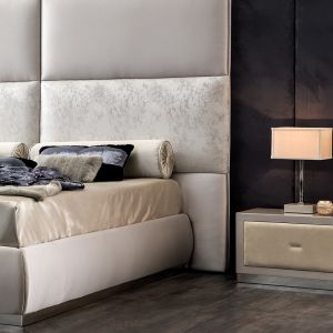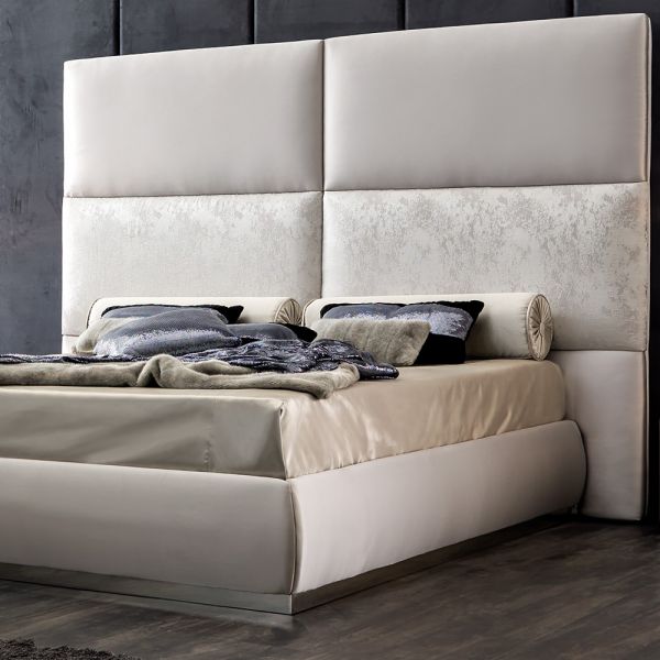 Panel Upholstered Bed With Tall Headboard. This seductive bed uses gorgeous combinations of finishes and textures to make a luxurious statement. This glamorous design features a fabulous tall statement padded upholstered headboard in two textured oyster f