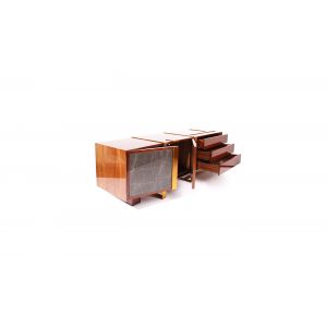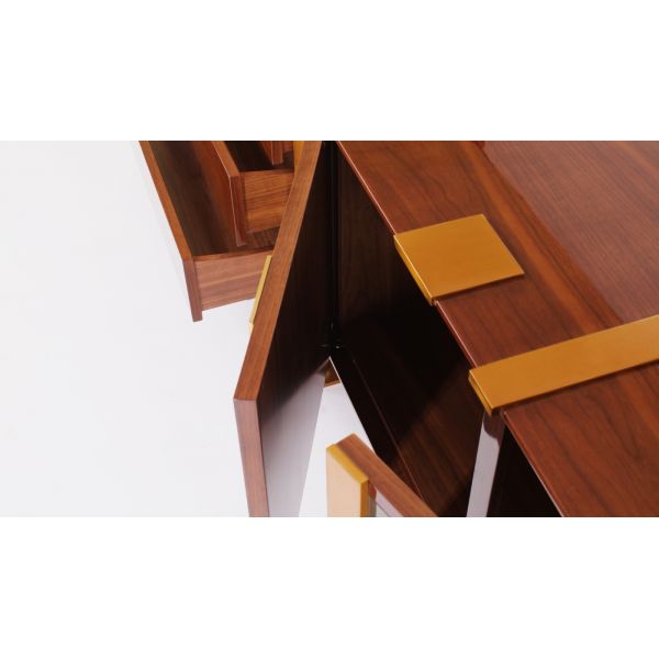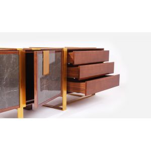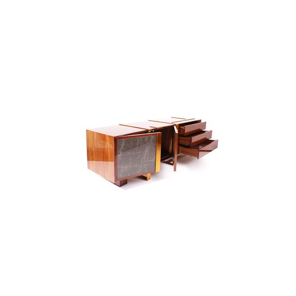 Structure: American walnut, Grey Kenzo marble Base: American walnut, polished brass Interior: Smoked glass shelves Details: Polished brass