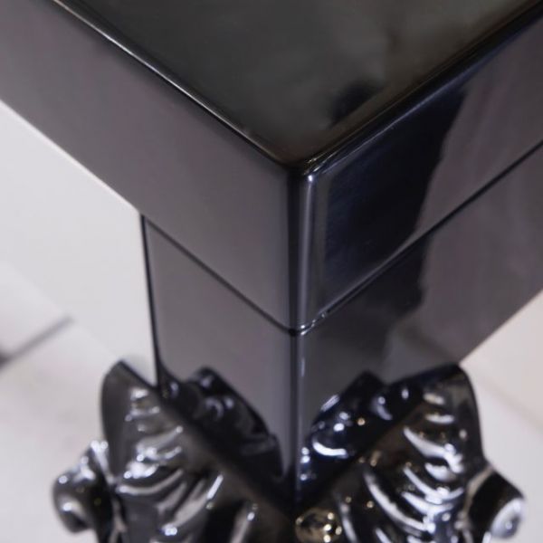 The Modern Baroque Black Console Table is shown here in a black high gloss finish with baroque style legs with silver details. 2 drawers with silver leaf fronts with a push pull mechanism. As comfortable in a dining room, lobby or study as it is as a welc